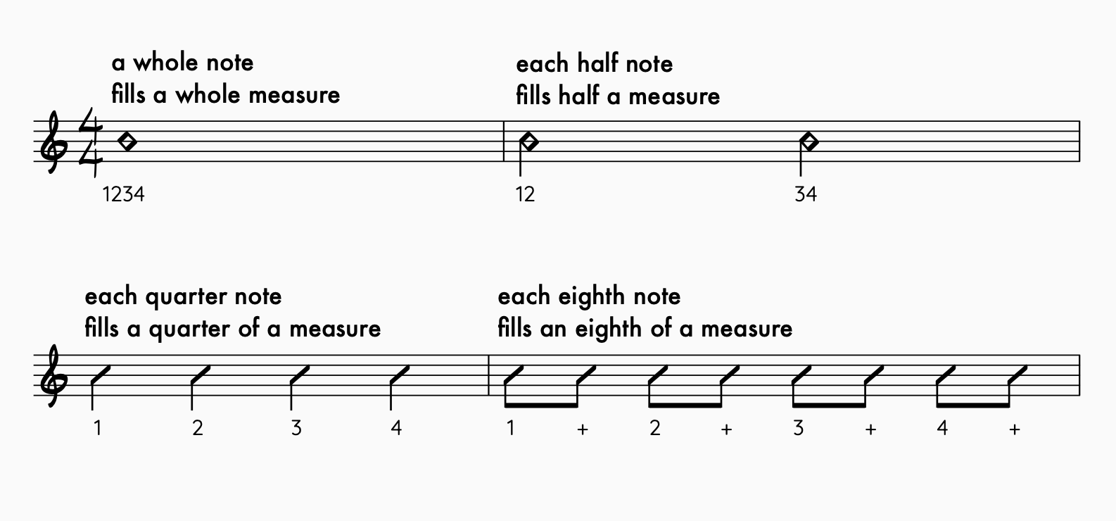 Whole notes. Half notes. “Each eighth note fills an eighth of a measure.”
